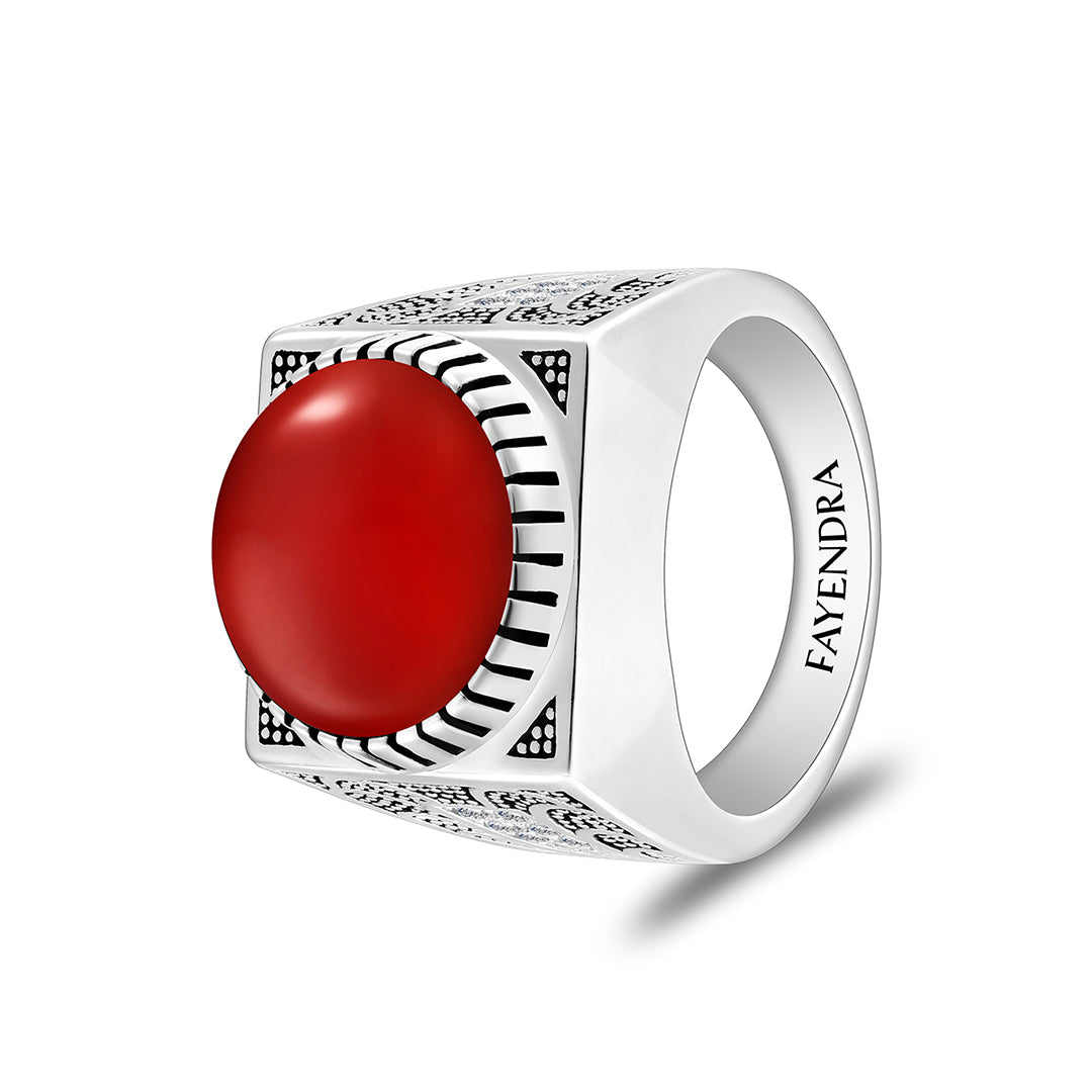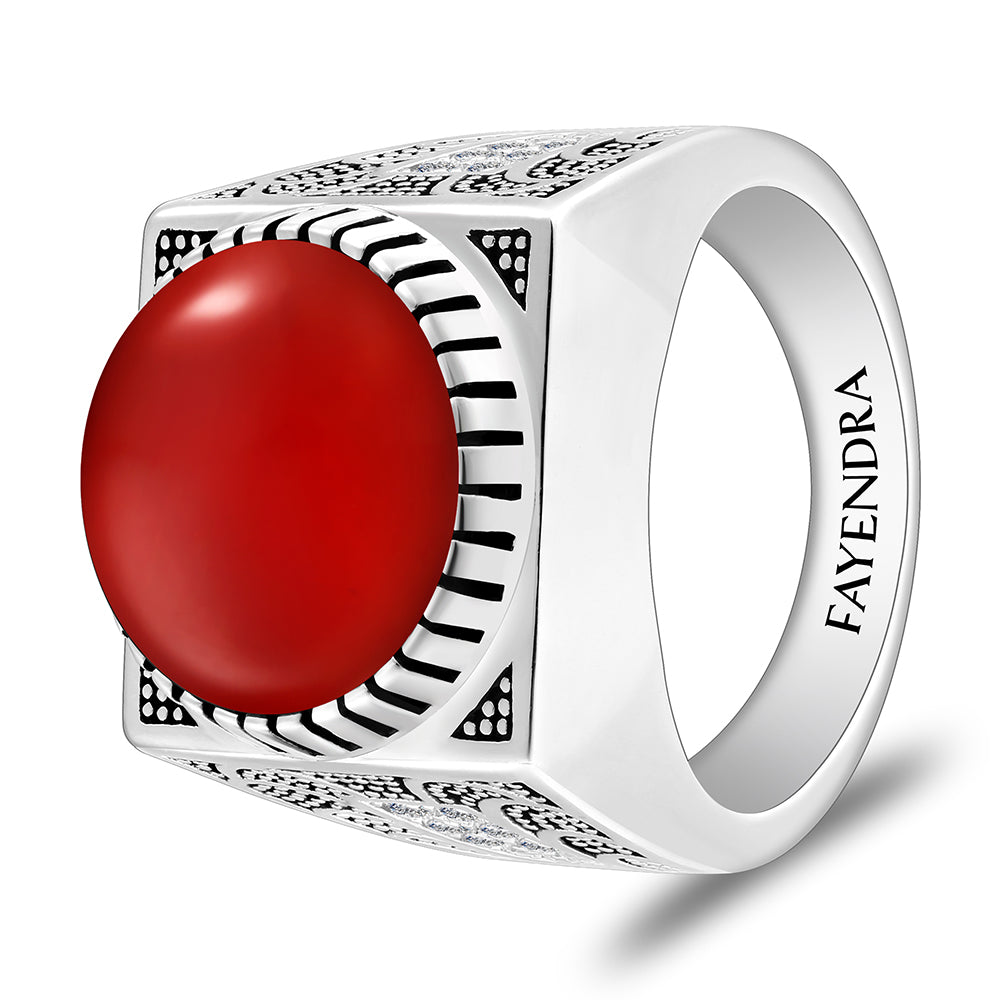 خاتم رجالي من الفضة الخالصة عيار 925 مطلي روديوم و اسود مرصع احجار عقيق احمر كابشون و فص ابيض