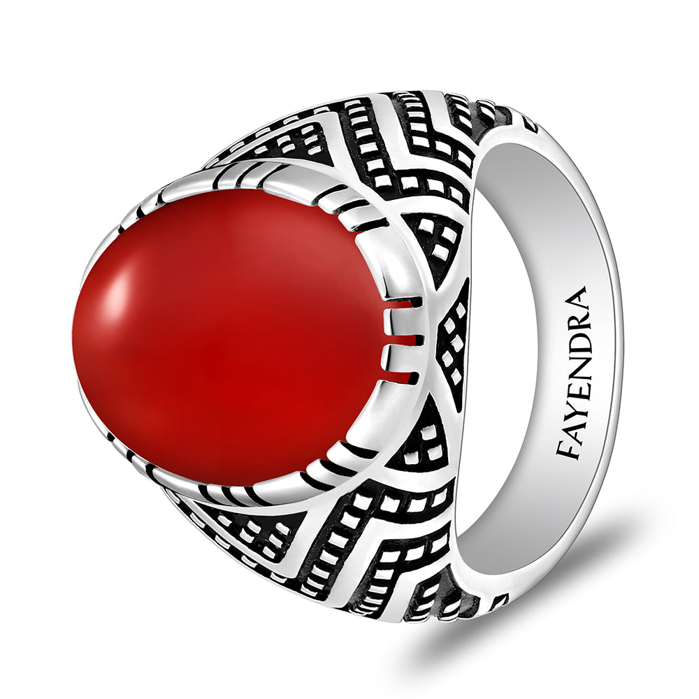تجسّد صناعة فايندرا روح الإبداع اللامحدود والإتقان الفني الرفيع، ويترجم ذلك بوضوح من خلال هذا الخاتم الرائع، المصنوع من الفضة الخالصة عيار 925 والمطلي بالروديوم لمزيد من الحماية واللمعان. يتميز الخاتم بتصميم فريد مزدان بنقوش دقيقة من النقاط والخطوط المتقنة، بينما يتوسّطه حجر عقيق أحمر طبيعي مصقول بقصّة كابشون المميزة، ما يمنحه توازنًا بصريًا رائعًا ويجسّد عراقة التصميم في كل تفصيلة. اقتنيه الآن وعبّر عن ذوقك الرفيع!