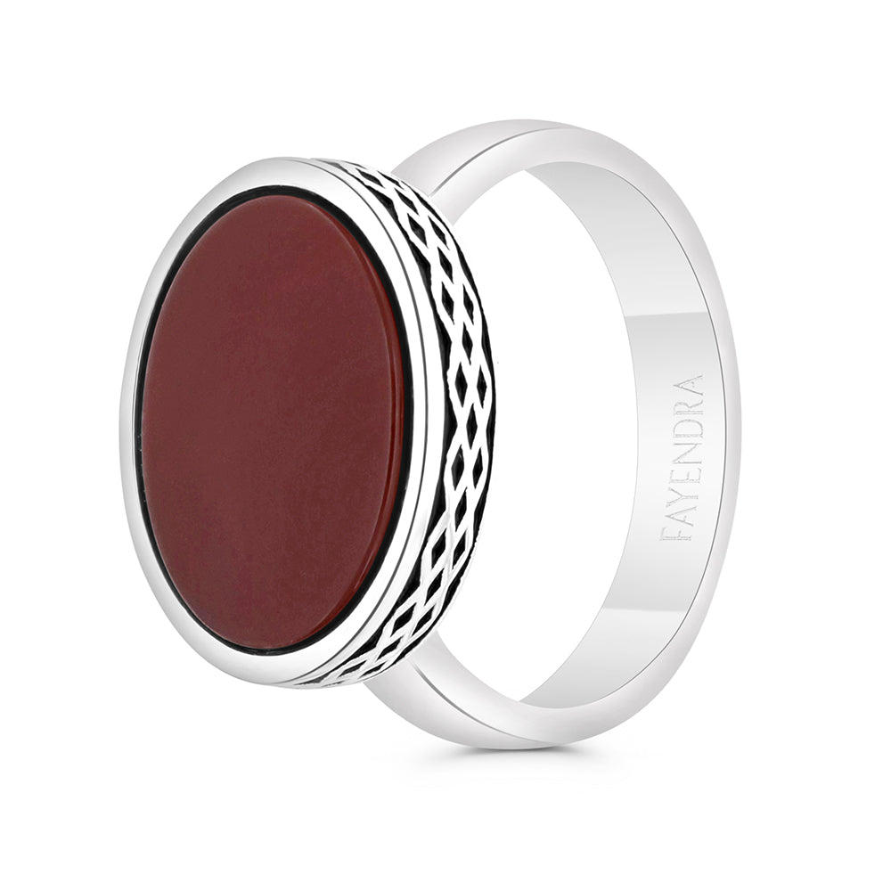 خاتم رجالي فخم يجمع بين العراقة والحداثة ، مصنوع من الفضة الإسترليني عيار 925 ويتوّجه حجر العقيق الأحمر الطبيعي، يزيّن معدنه طلاء أسود فاخر و يطلي معدنه طلاء من الروديوم للمزيد من المتانة واللمعان.
