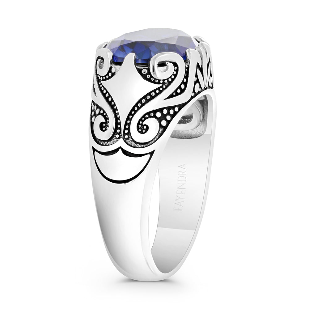 Total weight: 9g Enjoy the luxury of owning this ring, designed with creativity and exceptionalism. A sterling silver ring for men with an oval design inlaid with a natural onyx stone and its metal is decorated with motifs in dazzling artistic shapes.