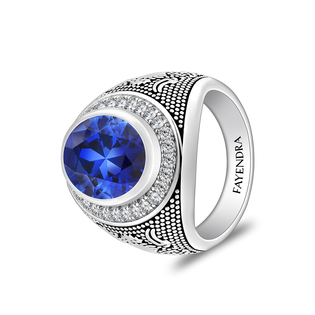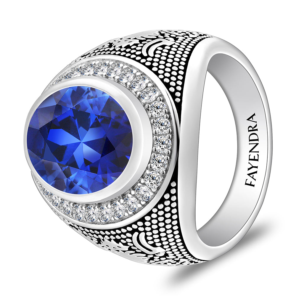 خاتم رجالي من الفضة الخالصة عيار 925 مطلي روديوم و اسود مرصع احجار زفير كروندوم و فص ابيض