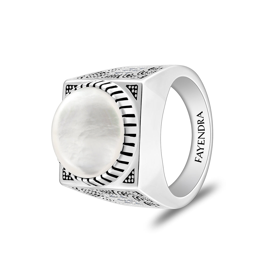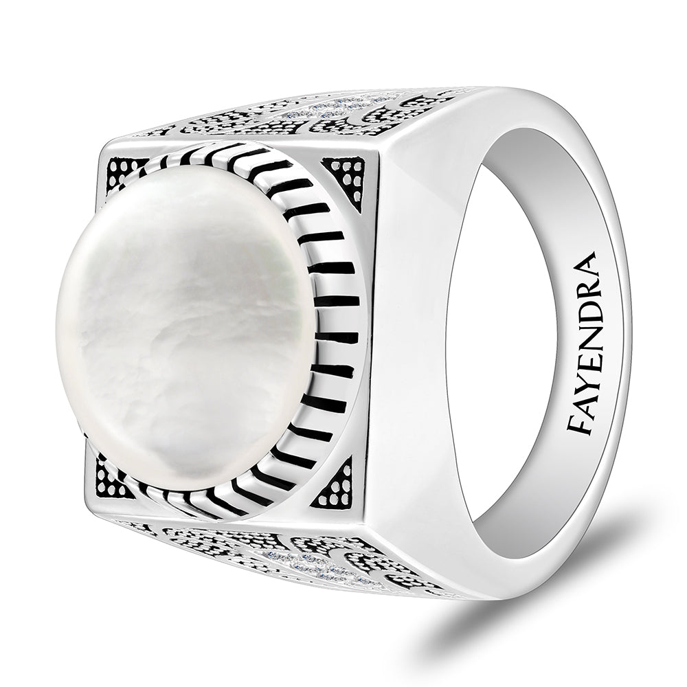 خاتم رجالي من الفضة الخالصة عيار 925 مطلي روديوم و اسود مرصع احجار صدف ابيض كابشون و فص ابيض
