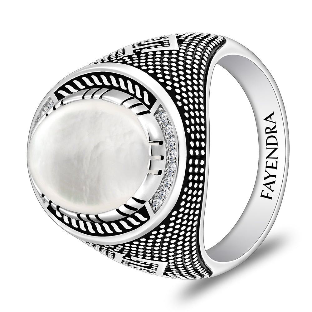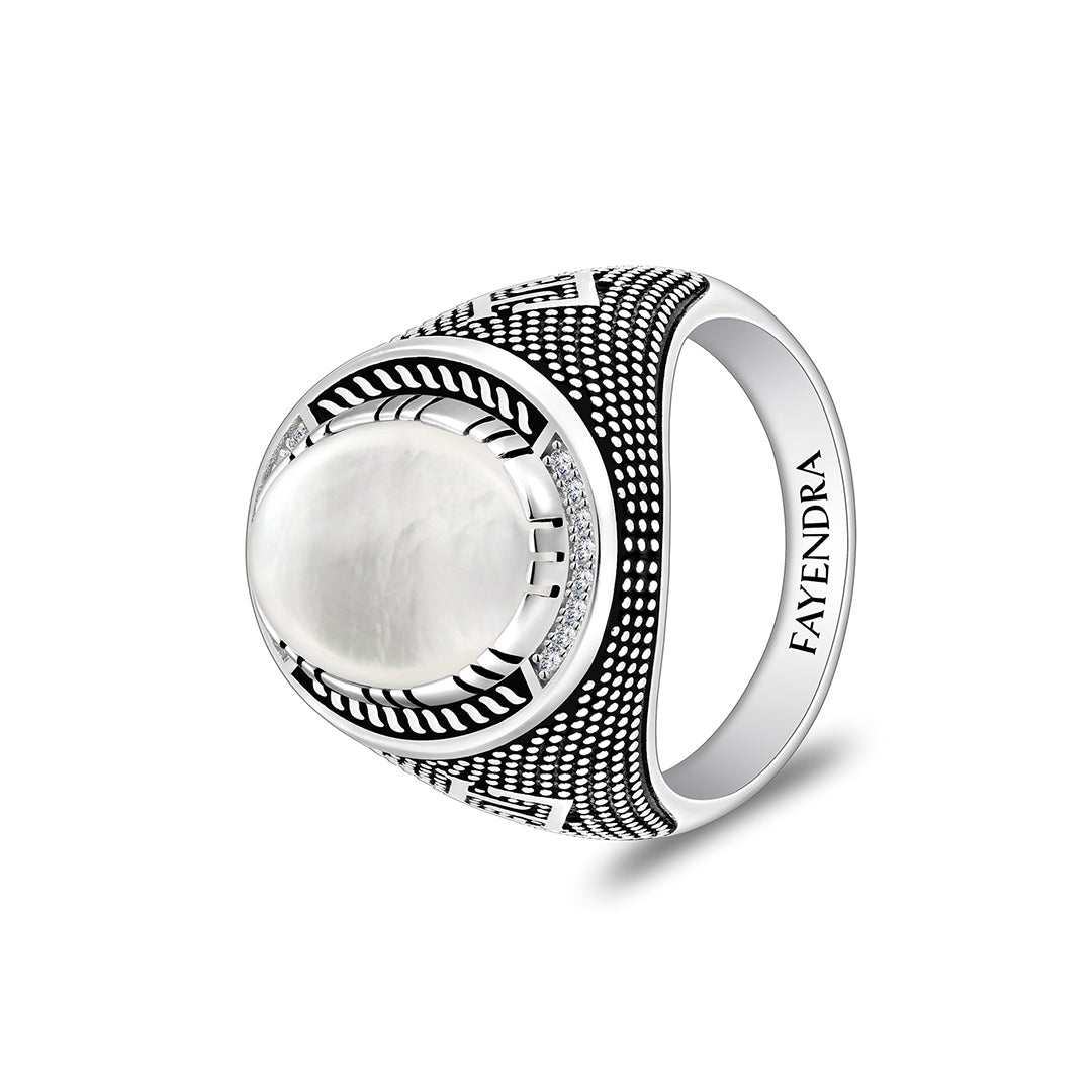 خاتم رجالي من الفضة الخالصة عيار 925 مطلي روديوم و اسود مرصع احجار صدف ابيض كابشون و فص ابيض