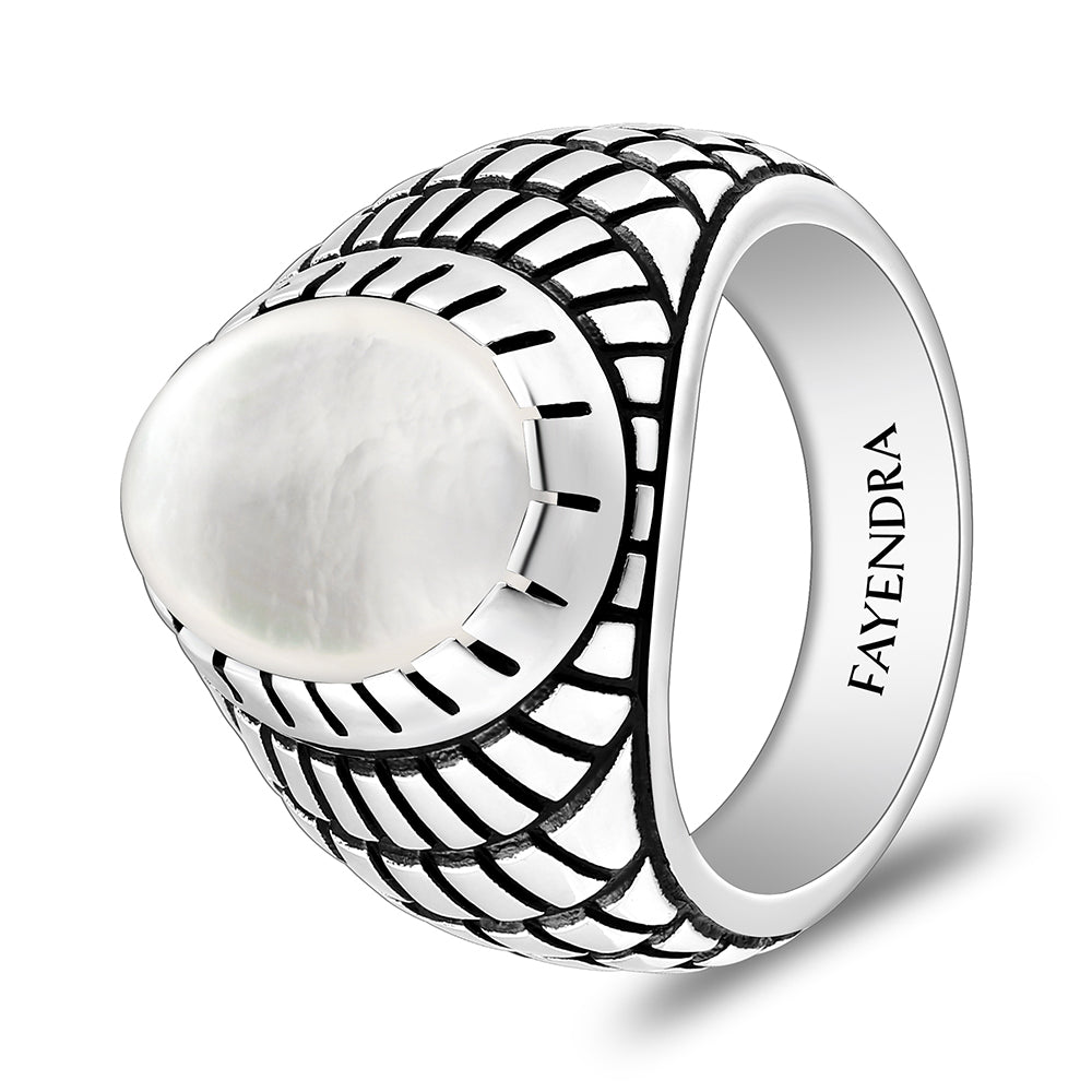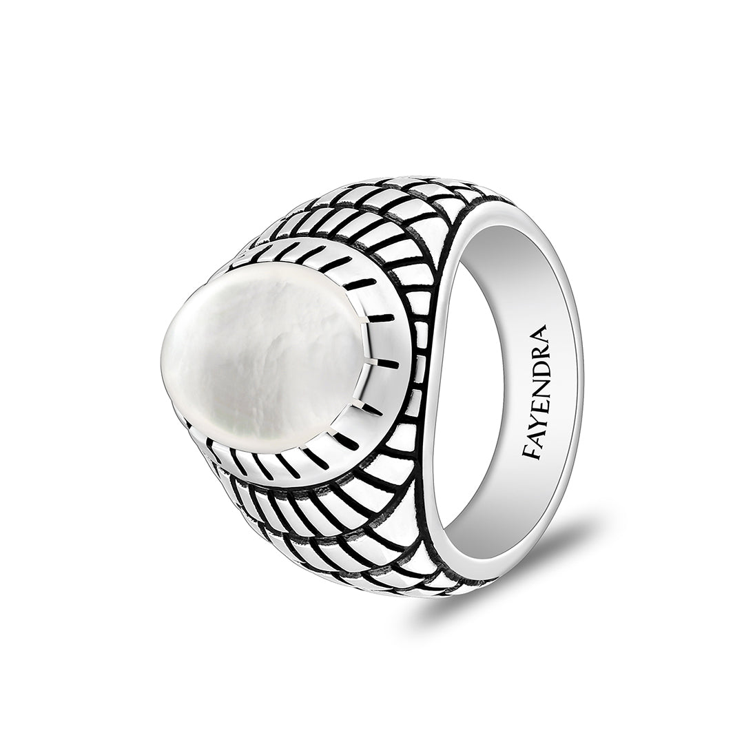خاتم رجالي من الفضة الخالصة عيار 925 مطلي روديوم و اسود مرصع احجار صدف ابيض كابشون