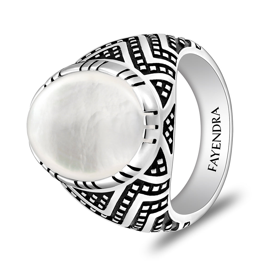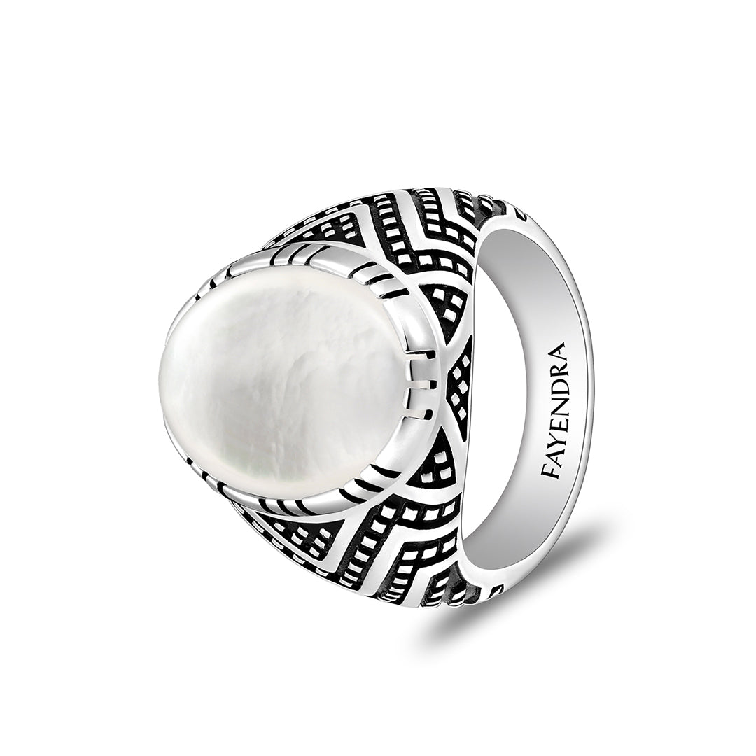 تجسّد صناعة فايندرا روح الإبداع اللامحدود والإتقان الفني الرفيع، ويترجم ذلك بوضوح من خلال هذا الخاتم الرائع، المصنوع من الفضة الخالصة عيار 925 والمطلي بالروديوم لمزيد من الحماية واللمعان. يتميز الخاتم بتصميم فريد مزدان بنقوش دقيقة من النقاط والخطوط المتقنة، بينما يتوسّطه حجر صدف أبيض مصقول بقصّة كابشون المميزة، ما يمنحه توازنًا بصريًا رائعًا ويجسّد عراقة التصميم في كل تفصيلة. اقتنيه الآن وعبّر عن ذوقك الرفيع!
