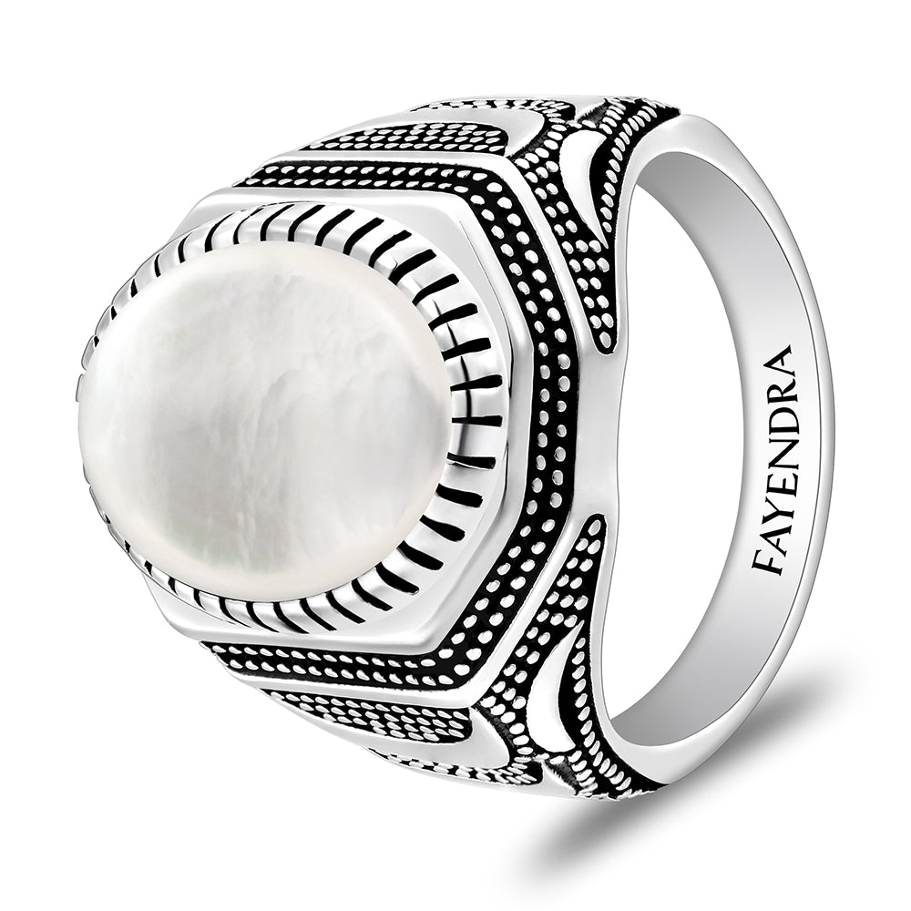 خاتم رجالي من الفضة الخالصة عيار 925 مطلي روديوم و اسود مرصع احجار صدف ابيض كابشون