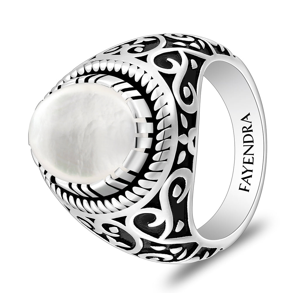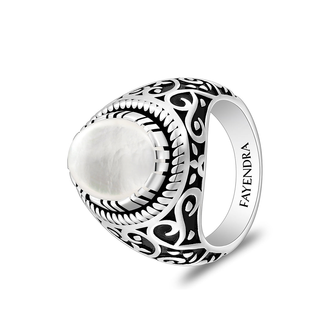 خاتم رجالي من الفضة الخالصة عيار 925 مطلي روديوم و اسود مرصع احجار صدف ابيض كابشون