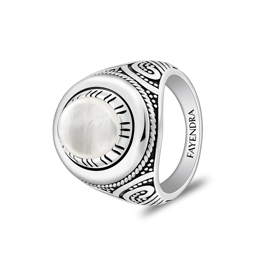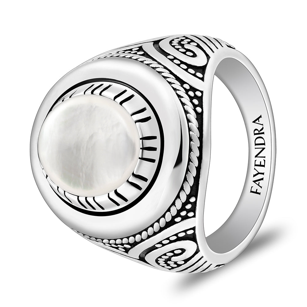 خاتم رجالي من الفضة الخالصة عيار 925 مطلي روديوم و اسود مرصع احجار صدف ابيض كابشون