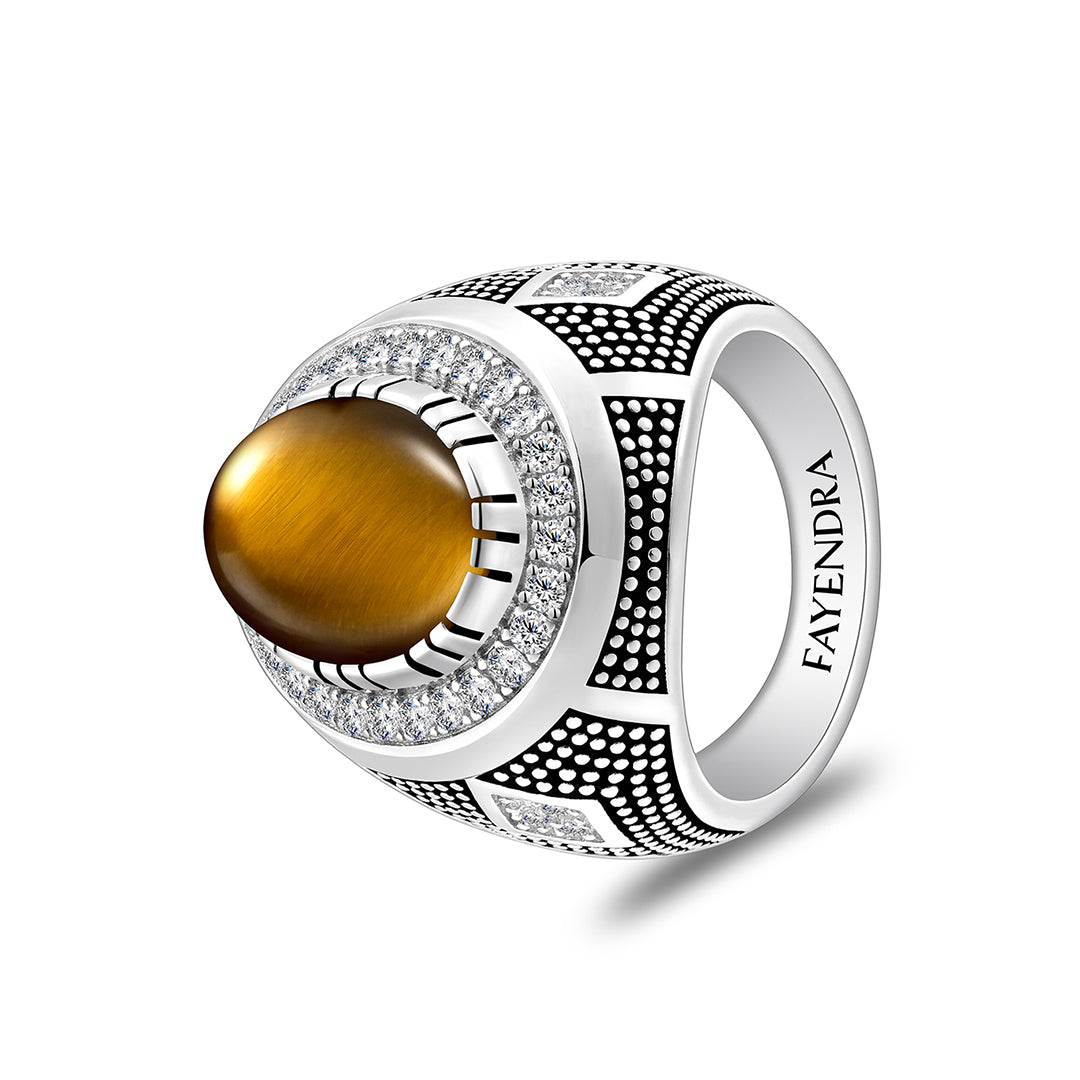 خاتم رجالي من الفضة الخالصة عيار 925 مطلي روديوم و اسود مرصع احجار عين النمر اصفر كابشون و فص ابيض