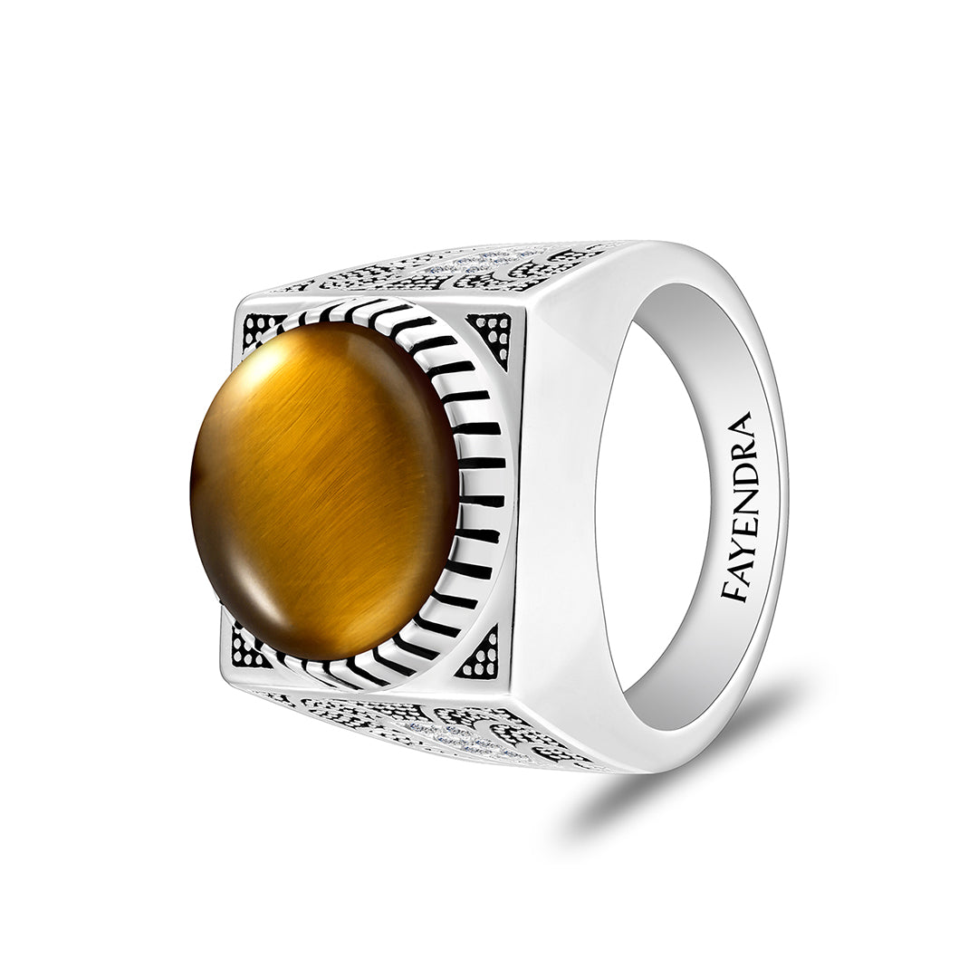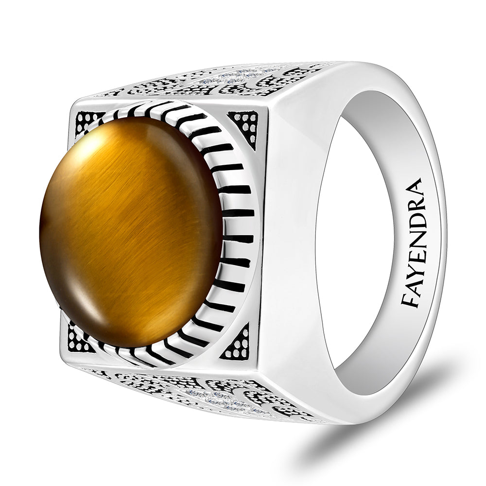 خاتم رجالي من الفضة الخالصة عيار 925 مطلي روديوم و اسود مرصع احجار عين النمر اصفر كابشون و فص ابيض