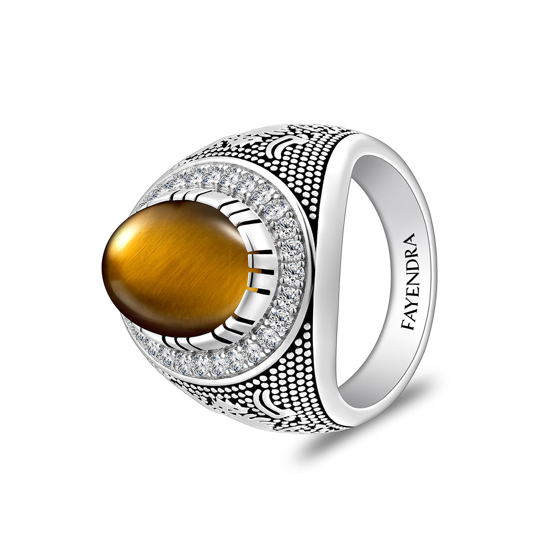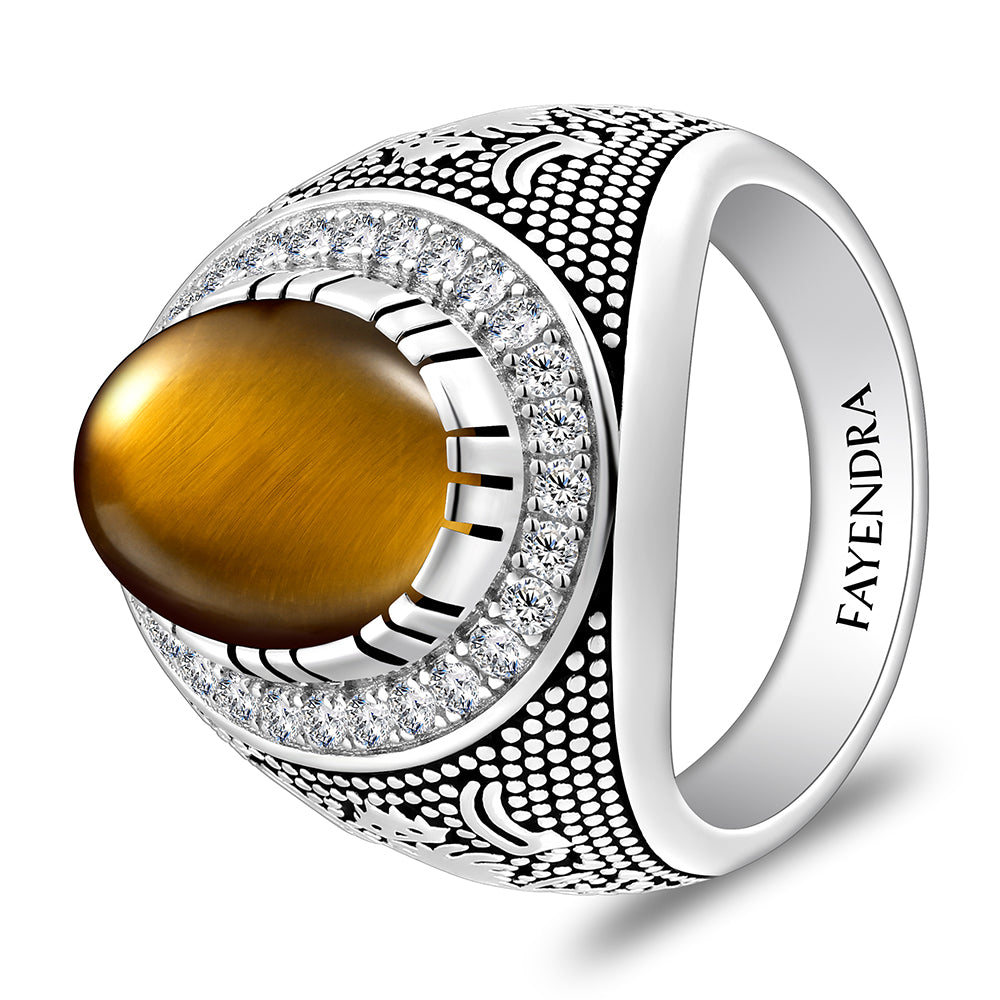 خاتم رجالي من الفضة الخالصة عيار 925 مطلي روديوم و اسود مرصع احجار عين النمر اصفر كابشون و فص ابيض