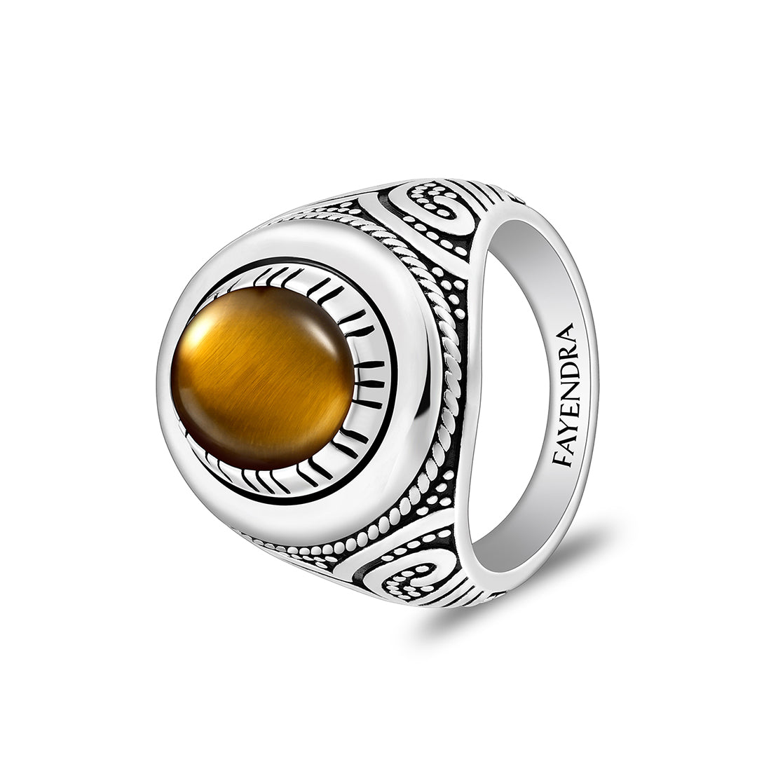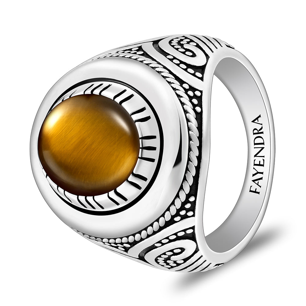 خاتم رجالي من الفضة الخالصة عيار 925 مطلي روديوم و اسود مرصع احجار عين النمر اصفر كابشون