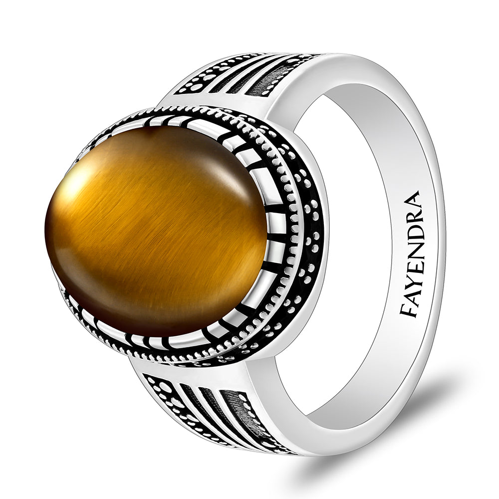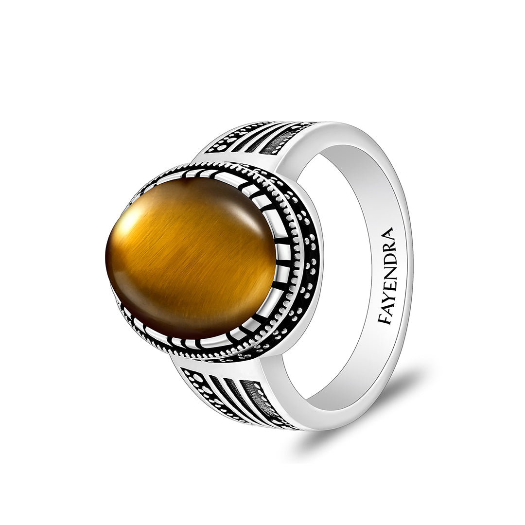 خاتم رجالي من الفضة الخالصة عيار 925 مطلي روديوم و اسود مرصع احجار عين النمر اصفر كابشون