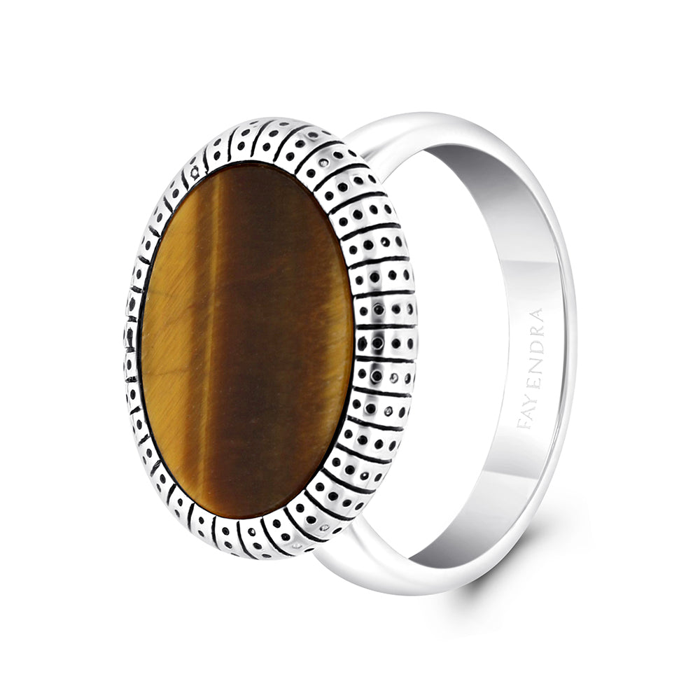 خاتم رجالي فاخر من الفضة الاسترلينية عيار 925 مرصع بحجر عين النمر البني الطبيعي ويزين معدنه المطلي بالروديوم نقوش سوداء تزيده رونقاً، نسقه مع كبك بالتصميم نفسه واعكس أناقتك وذوقك الفخم الرفيع.