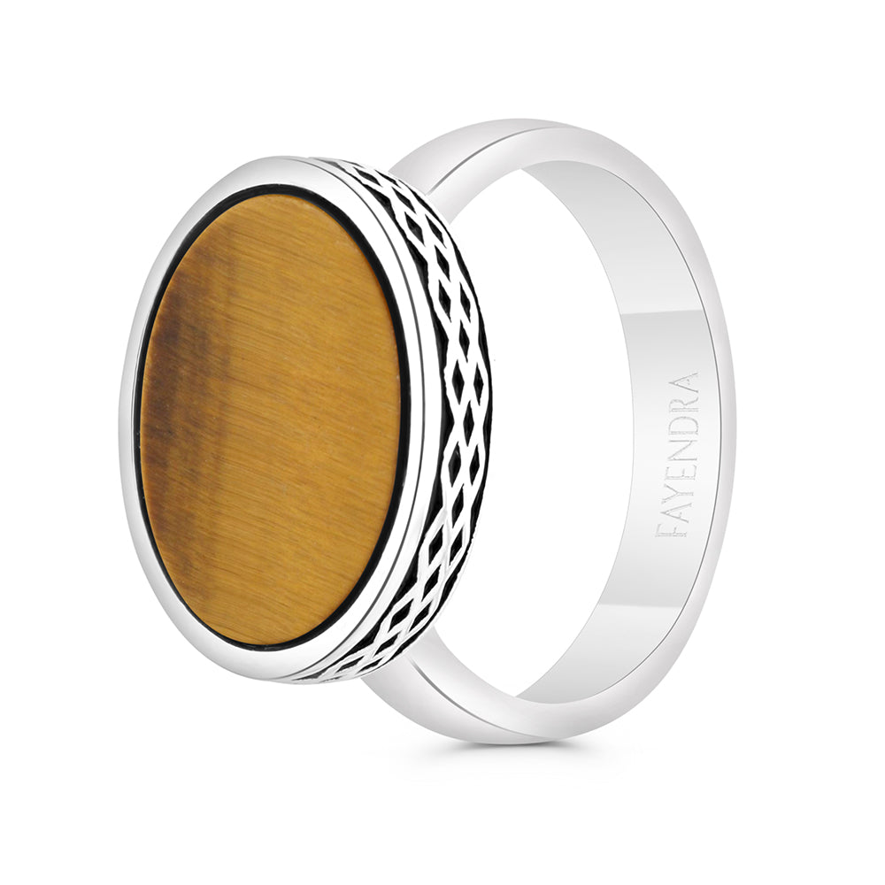 خاتم رجالي فخم يجمع بين العراقة والحداثة ، مصنوع من الفضة الإسترليني عيار 925 ويتوّجه حجر عين النمر البني الطبيعي، يزيّن معدنه طلاء أسود فاخر و يطلي معدنه طلاء من الروديوم للمزيد من المتانة واللمعان.