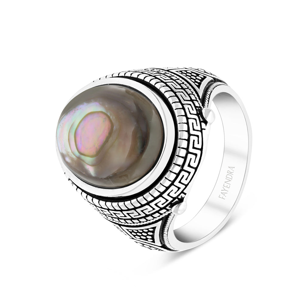 خاتم رجالي فضة عيار 925 مطلي روديوم مرصع احجار صدف استرالي