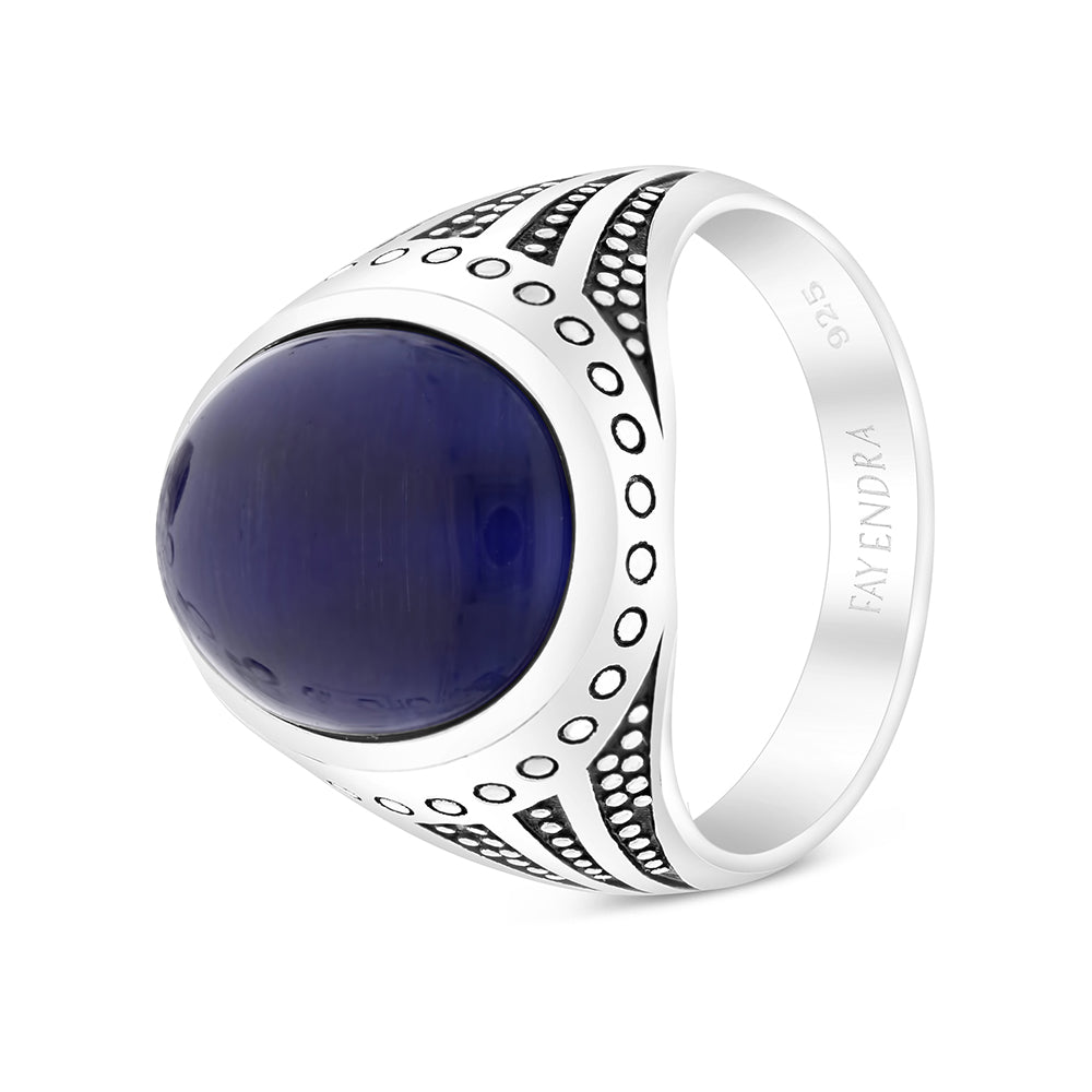 خاتم رجالي فضة عيار 925 مطلي روديوم مرصع احجار عين النمر ازرق