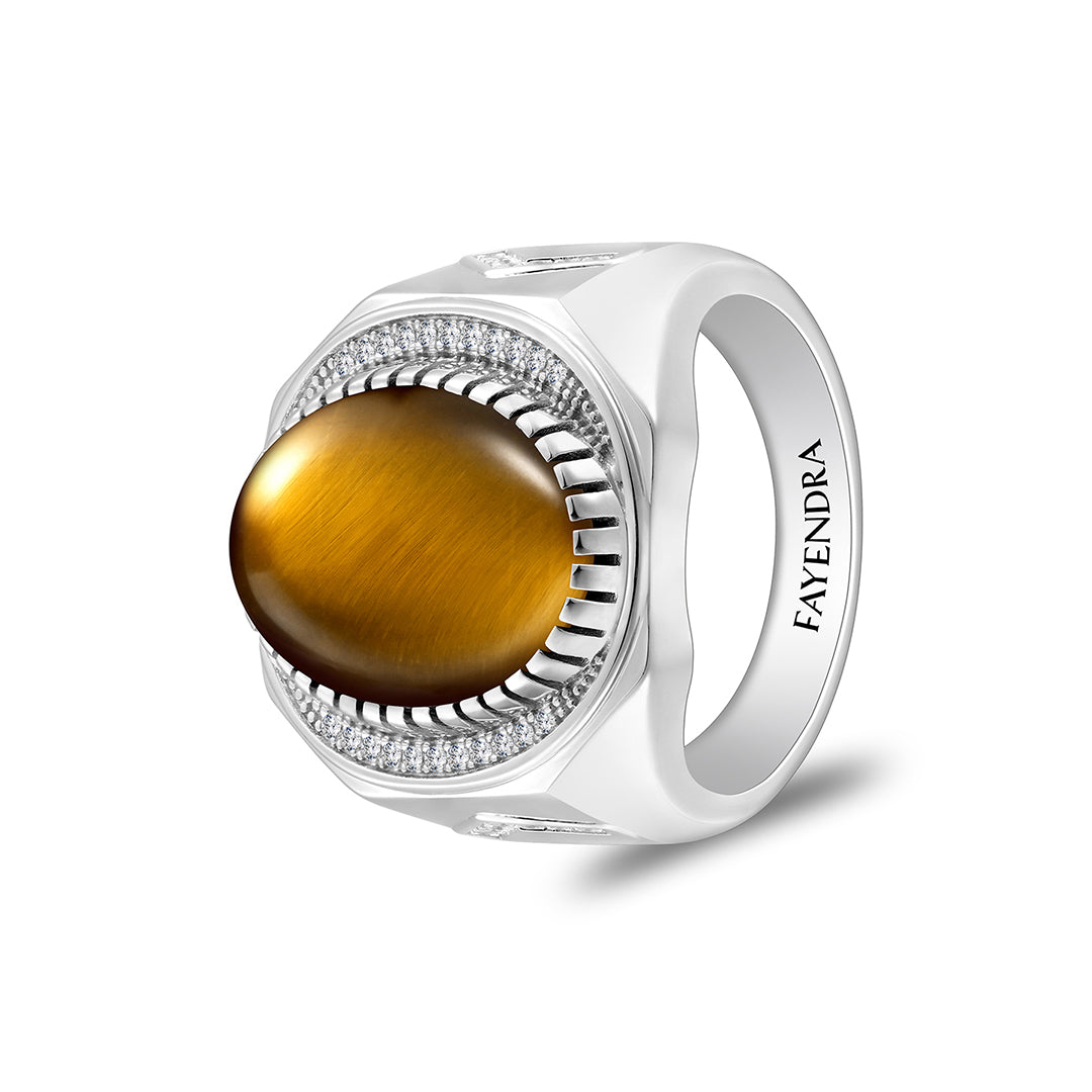 خاتم رجالي من الفضة الخالصة عيار 925 مطلي روديوم مرصع احجار عين النمر اصفر كابشون و فص ابيض