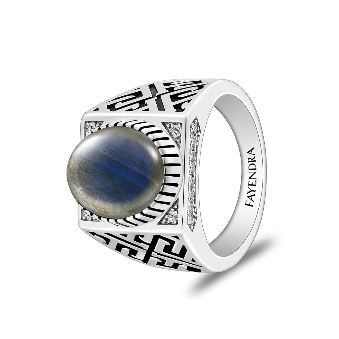 خاتم رجالي من الفضة الخالصة عيار 925 مطلي روديوم مرصع احجار لابرادوريت اوبالي كابشون وفص ابيض