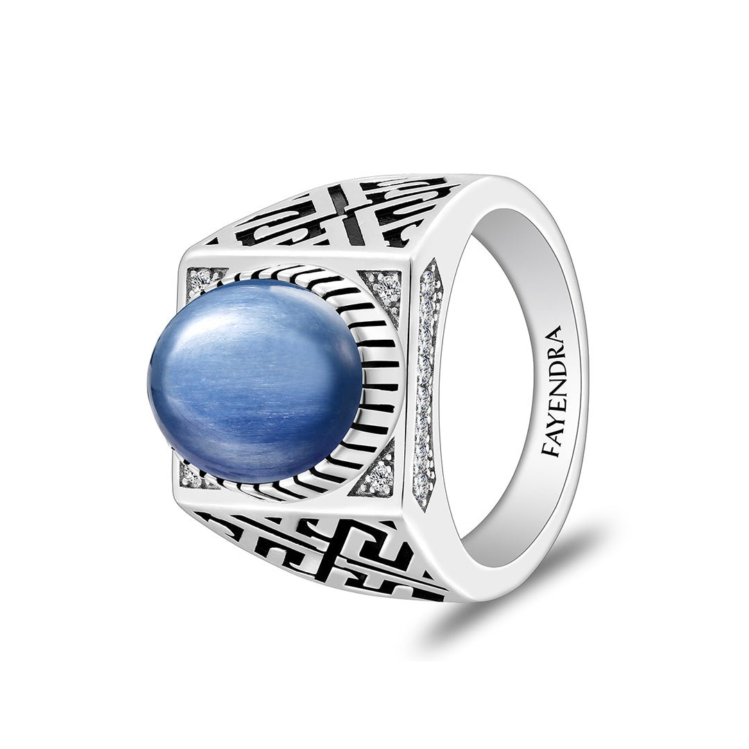خاتم رجالي من الفضة الخالصة عيار 925 مطلي روديوم مرصع احجار كيانيت طبيعي كابشون و فص ابيض