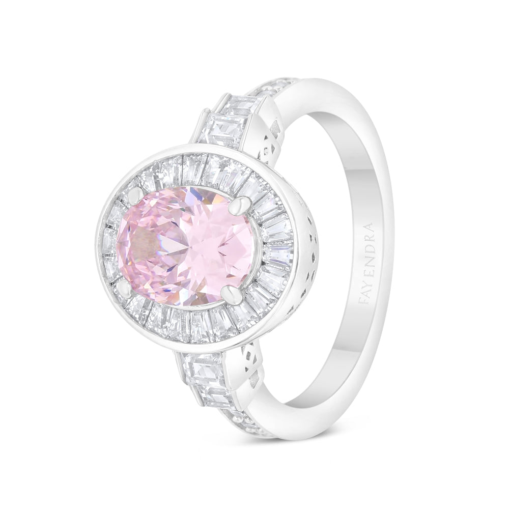 كوني محط الأنظار مع خاتمنا من الفضة الإسترلينية عيار 925 المطلي بالروديوم والمتميز بحجر زركون وردي بقصة أوفال تحيطه أحجار الزركون الأبيض اللامعة.