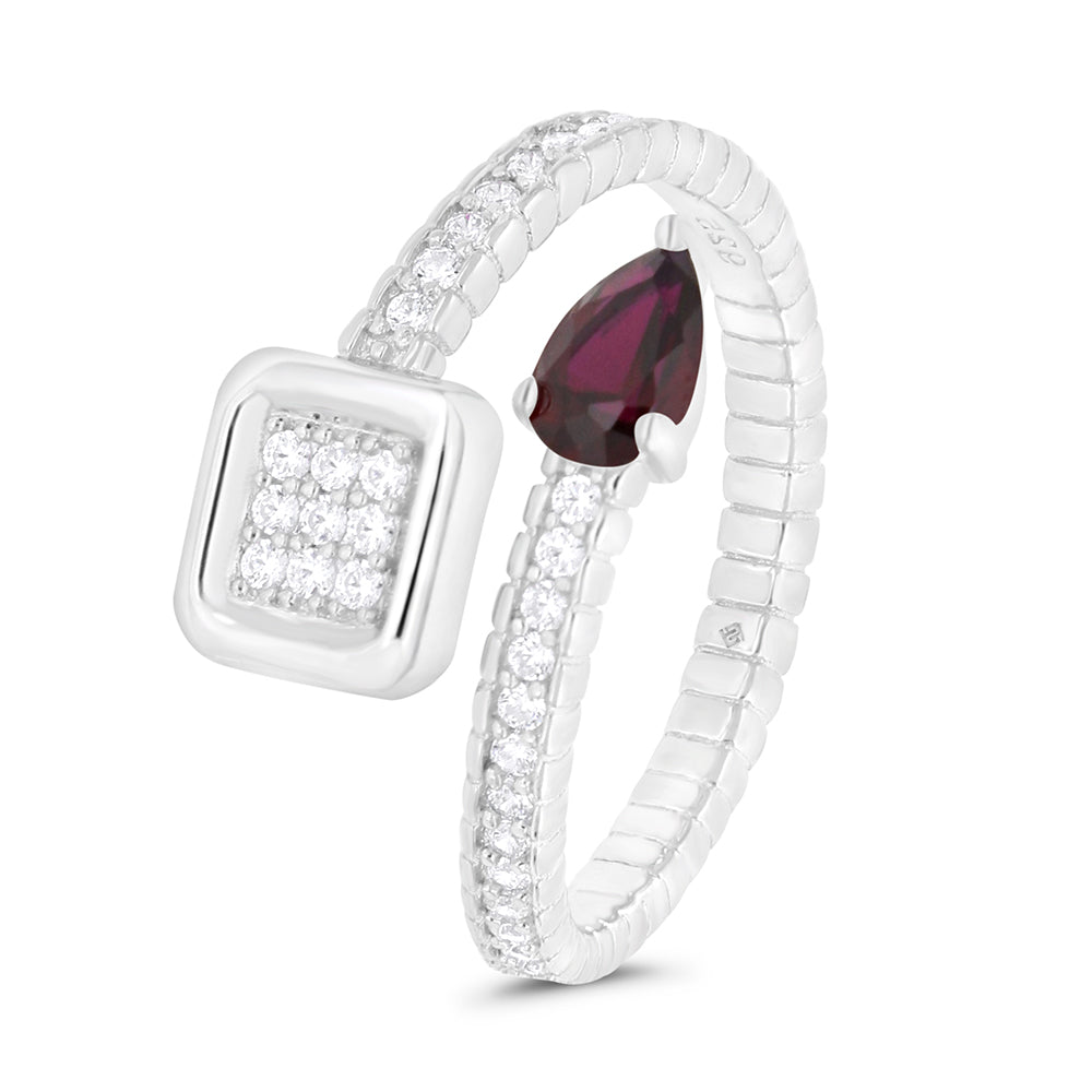 عبّري عن ذوقك العصريّ مع هذا الخاتم الرائع من الفضة الاسترلينية عيار 925 المميّز بتصميمه الفريد. الخاتم الفضي مطليّ بالروديوم للمزيد من المتانة واللمعان ومرصع بأحجار الزركون البيضاء اللامعة التي تغطي معظم معدنه، إضافة الى حجر يزين نهايته ويعطيه لوناً وحيوية من الياقوت كورندوم بقصة الدمعة.