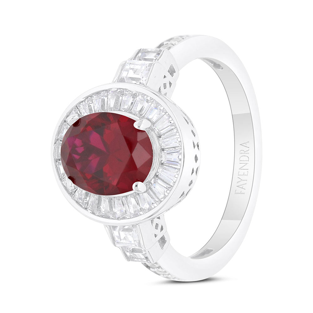 كوني محط الأنظار مع خاتمنا من الفضة الإسترلينية عيار 925 المطلي بالروديوم والمتميز بحجر ياقوت كورندوم بقصة أوفال تحيطه أحجار الزركون الأبيض اللامعة.