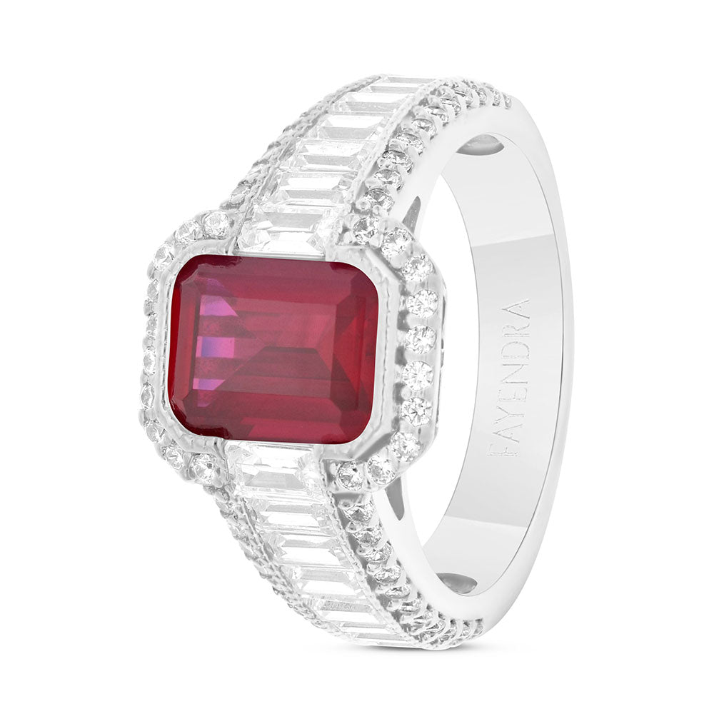 هذا الخاتم الآسر مصاغ من الفضة الإسترلينية عالية الجودة، المشهورة بمتانتها وبريقها اللامع. يغطيه طلاء الروديوم، مما يخلق خلفية مبهرة لحجر الياقوت كورندوم الساحر الذي يتوسط المعدن المرصع بالزركون الأبيض.