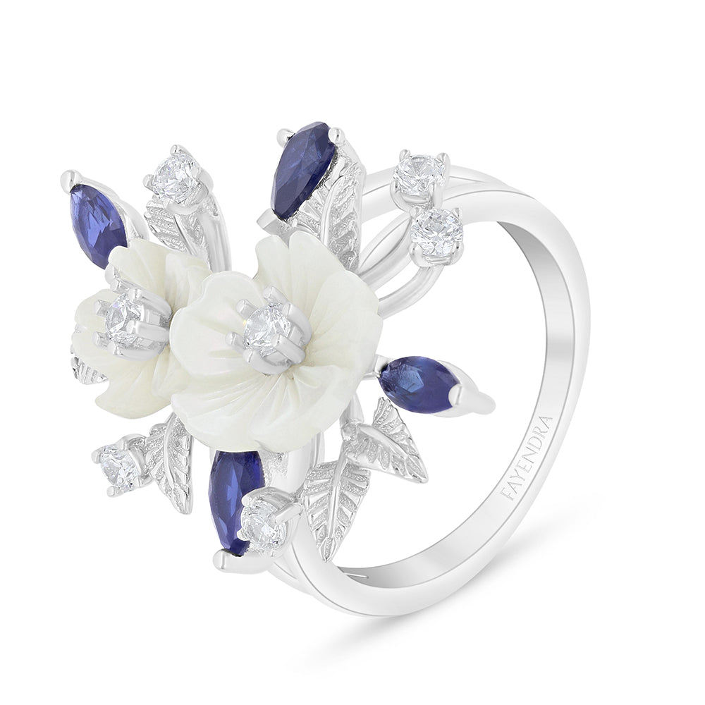 تألّقي بسحر الزهور وأناقتها مع هذا الخاتم الفريد من فايندرا، المصنوع من الفضة الخالصة عيار 925 والمطلية بالروديوم لبريق يدوم. يتألق التصميم بزهرتين منحوتتين من الصدف الطبيعي باللون الأبيض، تتلألآن بأحجار زركون فاخر بقصّة بريليانت، وتحيط بهما أحجار زفير كروندوم أزرق بقصة ماركيز ودمعة تضفي عمقًا لونياً ولمسة فاخرة. قطعة تنبض بالأنوثة والفخامة، اقتنيه الآن!
