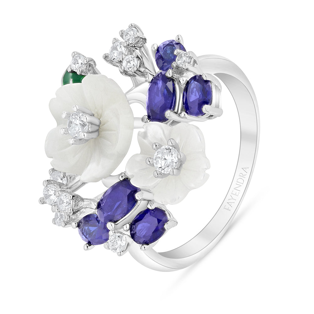 خاتم من الفضة الخالصة عيار 925 مطلي روديوم مرصع صدف ابيض و زفير كروندوم و فص ابيض