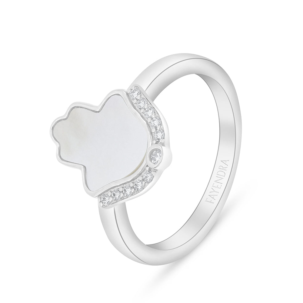 Total Weight: 3.2g استمتعي بإضافة لمسة راقية إلى إطلالتك مع هذا الخاتم من فايندرا،، المصنوعة من الفضة الخالصة عيار 925 والمطلي بالروديوم لحماية فائقة وبريق يدوم. تتألق الحواف بأحجار الزركون الأبيض الفاخر بقصّة بريليانت المبهرة التي تعكس الضوء بلمعان آسِر، فيما يتوسّط القطعة صدف أبيض طبيعي ينبض بنعومة وأناقة. انسجام مثالي بين البريق الفاخر وجمال المواد الطبيعية، يمنحك قطعة أنثوية راقية تكمّل حضورك بأسلوب عصري وفريد. ارتديها لتعبّري عن ذوقك الرفيع وثقتك اللافتة!