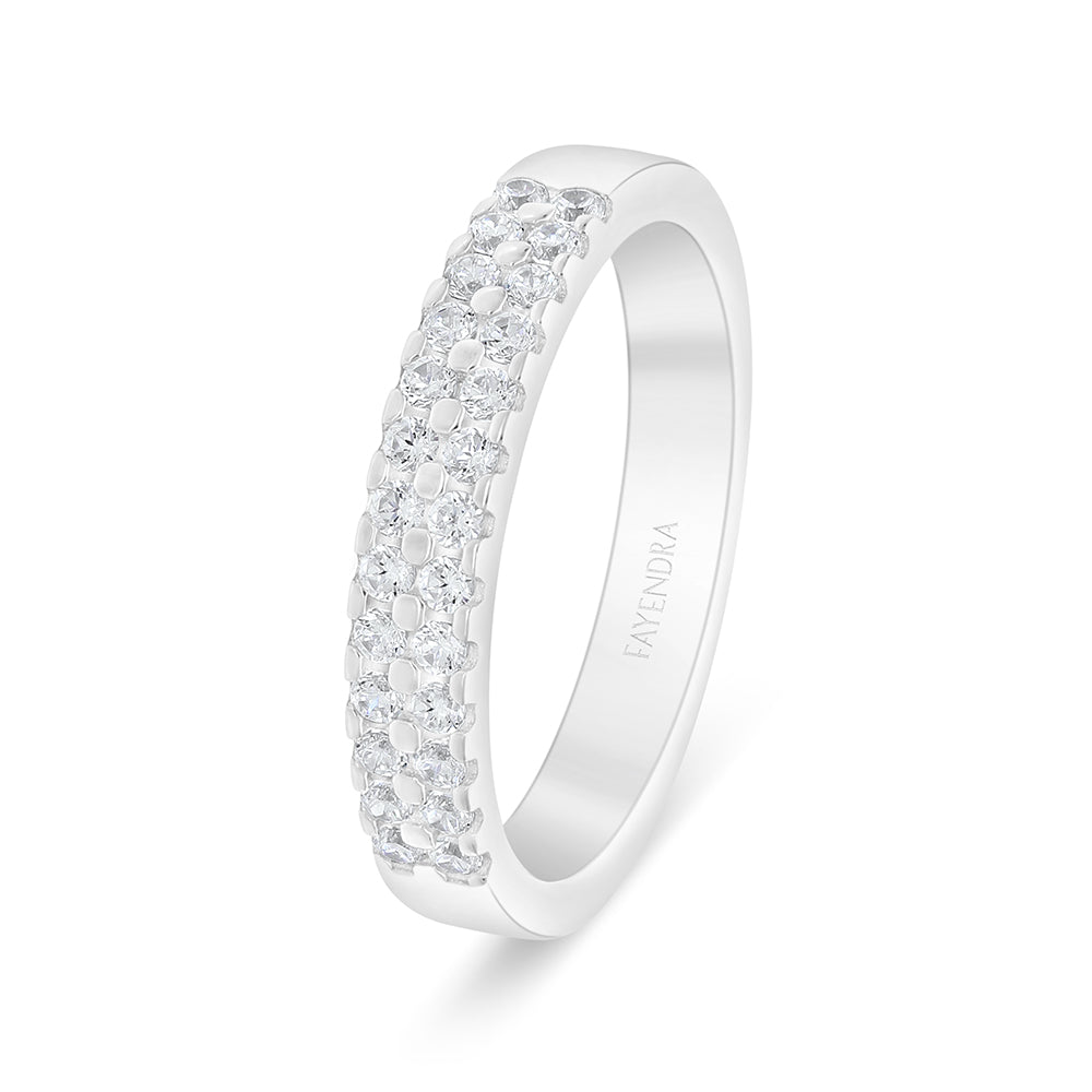Total Weight: 3.1g خاتم خطوبة يجسّد معنى التفرّد والتميّز، مصاغ بدقة من الفضة الإسترلينية عيار 925 ومطلي بطبقة من الروديوم لحماية فائقة ولمعان يدوم. يتألق بتصميم أنيق بإطار فضي عريض مرصّع بصفوف من أحجار الزركون الأبيض الخلّابة بقصة بريليانت المذهلة، ليكون رمزًا نقيًا لوعد الحب الأبدي. اجعليه خيارك الآن!