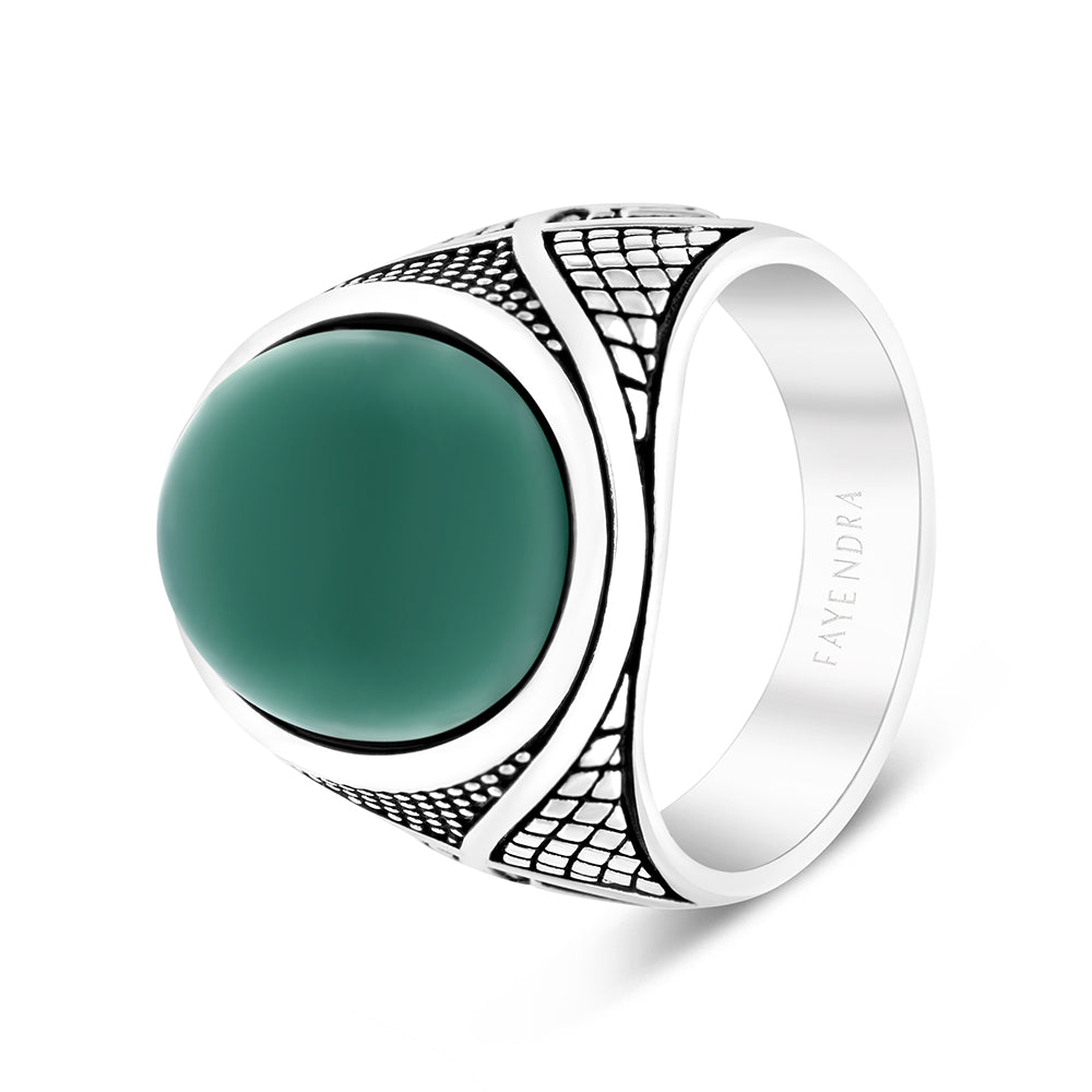 خاتم رجالي فضة عيار 925 مطلي روديوم احجار عقيق جاد اخضر طبيعي LOGO
