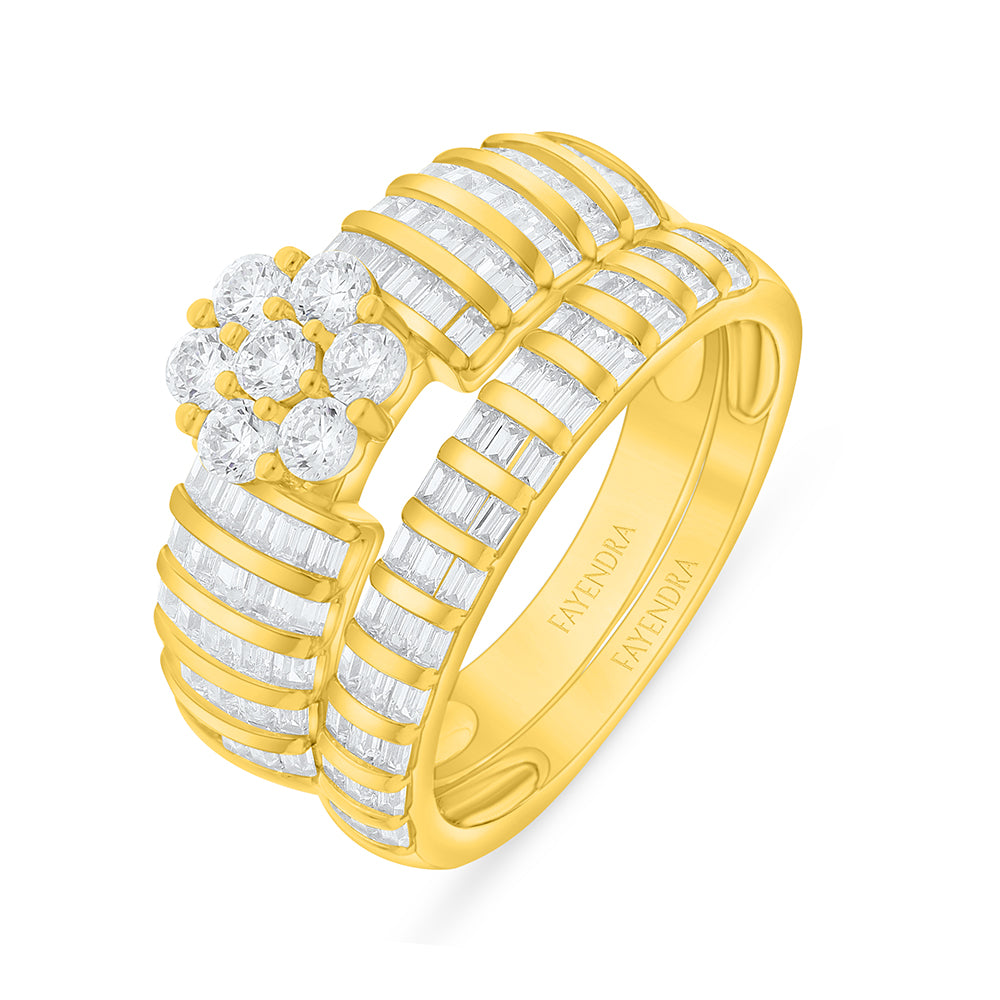Total Weight: 5.3g خاتم من فايندرا مصنوع من الفضّة الخالصة عيار 925 والمطلي بالذهب ليمنحه بريقًا فاخرًا يدوم طويلاً. تصميمه الفريد "توينز" يتألق بصفّين متوازيين من أحجار الزركون البيضاء البراقة بقصّة الباجيت المستطيلة المرصوفة بدقّة هندسية، تُعانق في المنتصف تفتّحًا آسرًا من أحجار الزركون المستديرة التي ترصّعت بأسلوب زهري متقن لتضفي لمسة من النعومة والأنوثة. توليفة استثنائية تجمع بين فخامة البريق وأناقة التوازن، لتمنحك قطعة تلفت الأنظار وترافقك بإطلالة ملكية لا تُقاوم. أقتنيه الآن !