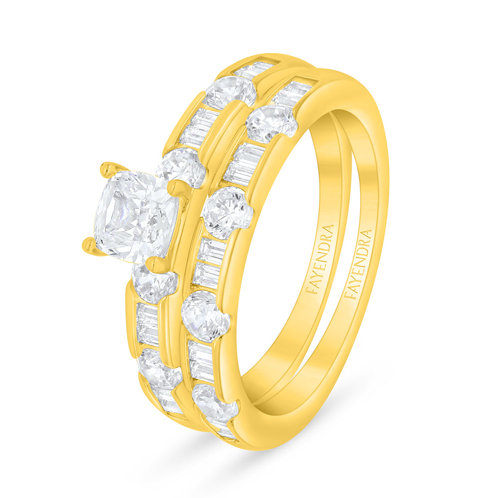 Total Weight: 5.4g خاتم من فايندرا مصنوع من الفضّة الخالصة عيار 925 والمطلي بالذهب ليحافظ على بريقه الفاخر دائمًا. تصميمه المميّز يجسّد لمسة "دبلة توينز" عصرية تتكوّن من حلقتين متداخلتين تلتفّان بانسجام راقٍ. يتوسّط الخاتم حجر زركون أبيض لامع بقصّة كوشن يسطع ببريقٍ أخّاذ، تحيط به على الذراع أحجار مستديرة متلألئة بقصّة بريليانت تضفي إشراقًا متدرجًا. يكتمل التصميم بصفوف متقنة من أحجار الباجيت المستطيلة المرصوفة بدقّة هندسية تمنح الخاتم عمقًا بصريًا وأناقة خالدة. قطعة فاخرة تجمع بين فخامة الترصيع ورونق التفاصيل، لترافقك بإطلالة ملكية آسرة تلفت الأنظار في كل مناسبة!