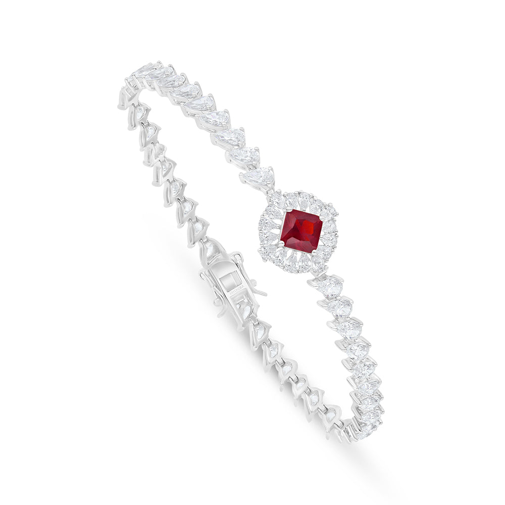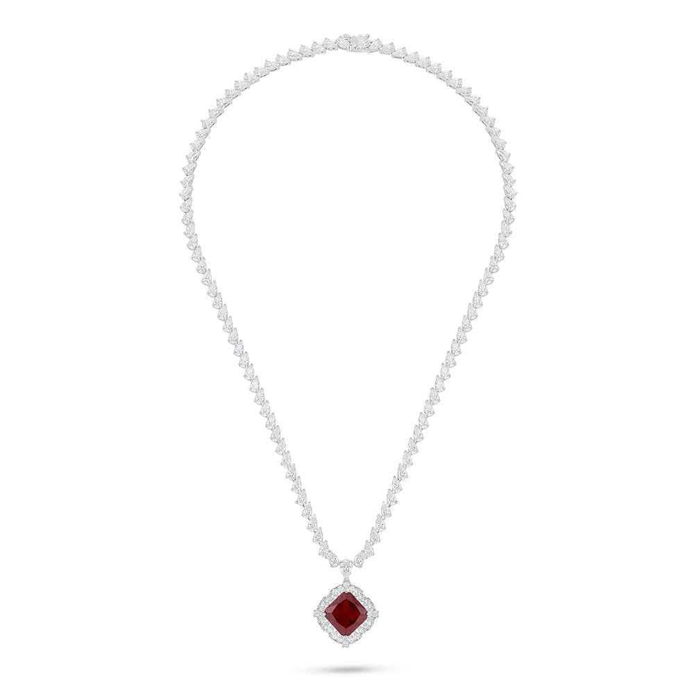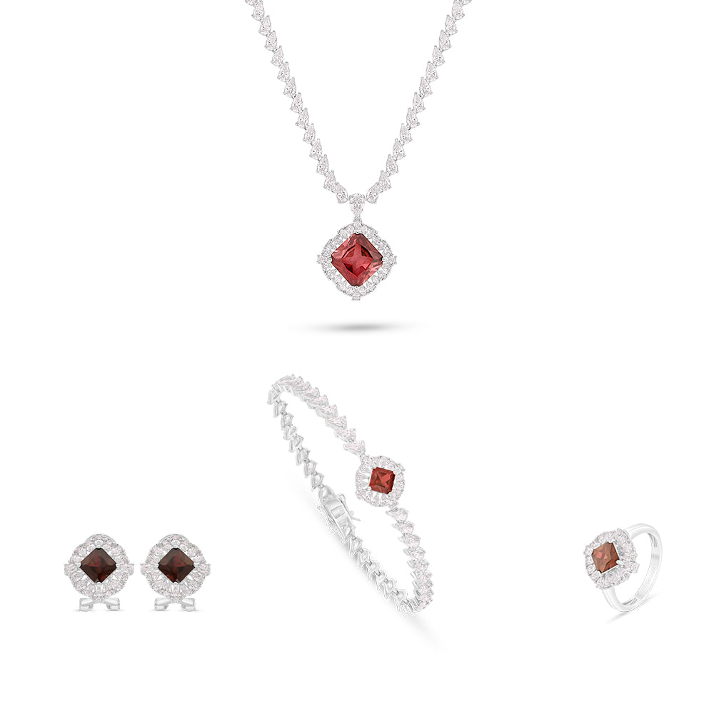 طقم من الفضة الخالصة عيار 925 مطلي روديوم و احجار ياقوت كروندوم و فص ابيض